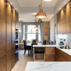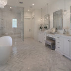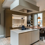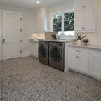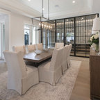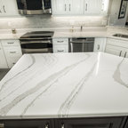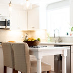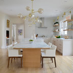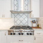 На фото: угловая кухня в стиле современная классика с фасадами в стиле шейкер, белыми фасадами, белым фартуком, техникой из нержавеющей стали, паркетным полом среднего тона, коричневым полом и белой столешницей с — Houzz