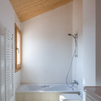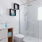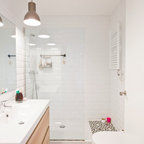 Стильный дизайн: ванная комната в скандинавском стиле с душем в нише, желтой плиткой, плиткой кабанчик, желтыми стенами и серым полом - последний тренд — Houzz
