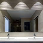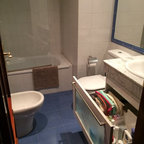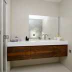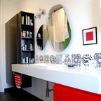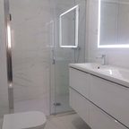 Неиссякаемый источник вдохновения для домашнего уюта: ванная комната в современном стиле с плоскими фасадами, белыми фасадами, белой плиткой, плиткой из листового камня, белыми стенами, настольной раковиной, серым полом и белой столешницей — Houzz