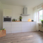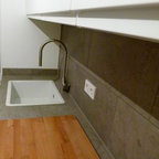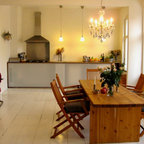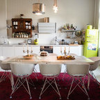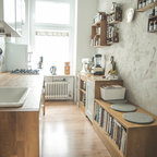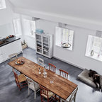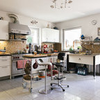 «Он мой любимый мастер по кухням», — делится Нора, воплотившая не один проект с этим столяром и дизайнером. Стоящий отдельно кухонный блок изготовлен из нержавеющей стали. В столешницу врезана варочная панель Bora со встроенной вытяжкой. В стоящей вдоль стены кухонной секции с глянцевыми серыми фасадами скрыты посуда и кулинарные книги.«Кто-то наверняка сочтет кухню слишком большой, — смеется архитектор, — но хозяева любят потчевать гостей. Вот тут-то ее размер и оправдывается».