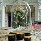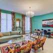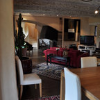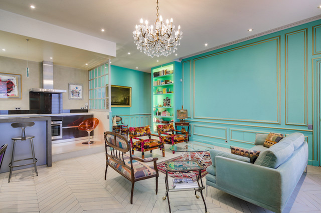 Неиссякаемый источник вдохновения для домашнего уюта: открытая гостиная комната среднего размера в стиле фьюжн с домашним баром, деревянным полом, серым полом и зелеными стенами без камина, ТВ — Houzz