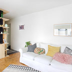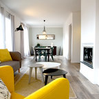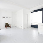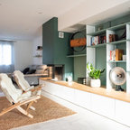 Выдающиеся фото от архитекторов и дизайнеров интерьера: большая открытая гостиная комната в скандинавском стиле с белыми стенами, светлым паркетным полом, горизонтальным камином и библиотекой без ТВ — Houzz