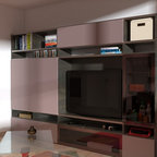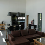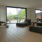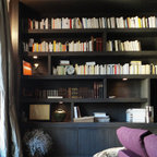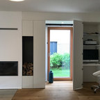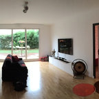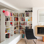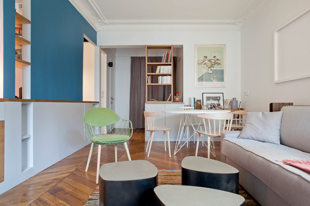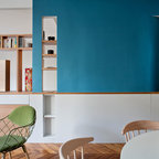 Сейчас от прихожей гостиную отделяет лишь книжный стеллаж — благодаря этому оригинальному ходу удалось визуально разграничить пространства, сохранив при этом их единство. Графичный, сдержанный дизайн круглого белого стола в окружении скандинавских стульев из светлого дерева выделяют столовую зону в гостиной. Стену рядом со стеллажом украшает репродукция картины Фрэнсиса Бэкона «Фигура пишущего, отраженная в зеркале» (Figure writing reflected in a mirror).Стол: XZ3 от Magis; стулья: J104 от Hay