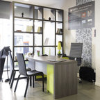 В этом французском проекте монитор выступает в роли телевизора. Так что если развернуть его к столику и достать клавиатуру, можно работать. А когда «кабинет» не нужен — складываем столешницу и разворачиваем экран в сторону кинозала в спальне.