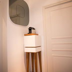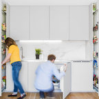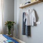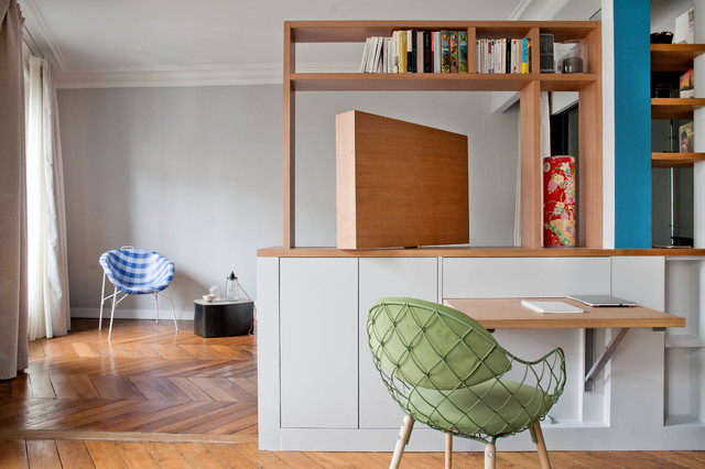 3. Вертеть телевизорВ этом французском проекте монитор выступает в роли телевизора. Так что если развернуть его к столику и достать клавиатуру, можно работать. А когда «кабинет» не нужен — складываем столешницу и разворачиваем экран в сторону кинозала в спальне.Дизайнер: Olivier Chabaud ArchitecteГде: г. Париж, Франция▶ Смотрите другие кадры из съемки проекта Appartement L, Paris