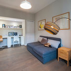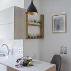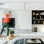 В гостиной архитектор продумал все до мельчайших деталей. Оригинальный ход — крутящаяся, будто парящая в воздухе рама для ТВ-экрана. Телевизор, таким образом, можно смотреть и с кровати, и от обеденного стола. Телевизионную стойку обрамляют полки с книгами.Еще одна дизайнерская находка — откидной рабочий стол.
