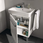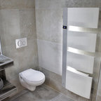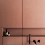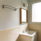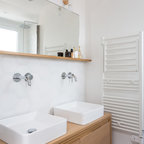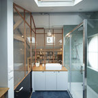 Стеклянная перегородка — как в ателье или мастерской — которая переходит в изголовье, — оригинальное решение в зонировании спальни и ванной. Она формирует здесь особую атмосферу, и конечно, подчеркивает архитектурность ванной. «Мы хотели, чтобы ванная, помимо своей основной функции также воспринималась и как живописный фон. Мы смягчили ее графичность, придав плавный изгиб дальней стене», — поясняет архитектор. Керамическая узорчатая Плитка Azulej от Патрисии Уркиола привносит динамику в отделку белоснежной ванной. «Чтобы придать характер сдержанному интерьеру ванной, мы решили использовать эту плитку, которая идеально вписалась в задуманную нами цветовую гамму», — подчеркивает Оливье Шабо. Плитка: Azulej, диз. Патрисия Уркиола (Patricia Urquiola) для бренда Mutina