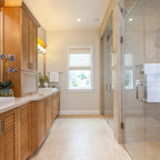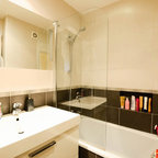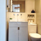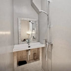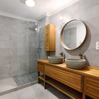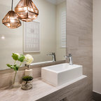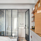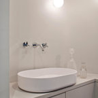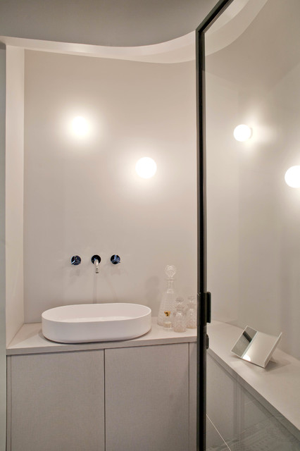 В течение дня оба пространства — ванную и спальню — заливает естественный свет, а по вечерам они начинают играть по-новому за счет теплого освещения.Мебель для ванной изготавливалась на заказ — стандартную модули не вписывались сюда из-за изгиба стены, а в саму стену встроили симпатичные светильники, чтобы еще раз подчеркнуть архитектурность решения. К тому же, округлые формы плафонов перекликаются с ночными лампами в спальне, усиливая связь между этими двумя пространствами. СТАТЬИ ПО ТЕМЕ…Лофты | Скандинавские | Загородные дома | Квартиры | Маленькое жилье | Houzz в гостях | Houzz в мире | США и Канада | Европа | Австралия