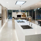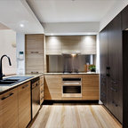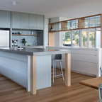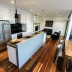 Пример оригинального дизайна: угловая кухня в современном стиле с обеденным столом, двойной раковиной, плоскими фасадами, белыми фасадами, техникой из нержавеющей стали, паркетным полом среднего тона и островом — Houzz