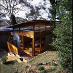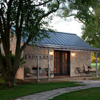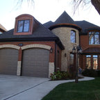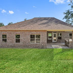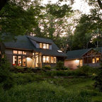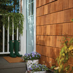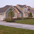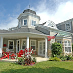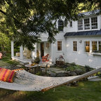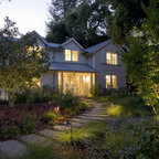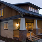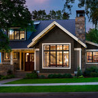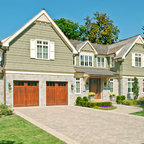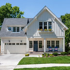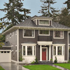 Свежая идея для дизайна: двухэтажный фасад дома серого цвета в классическом стиле с облицовкой из дерева и двускатной крышей - отличное фото интерьера — Houzz