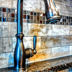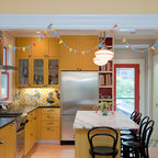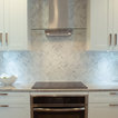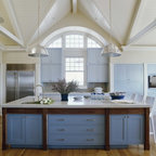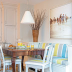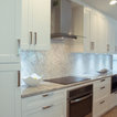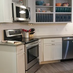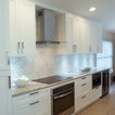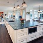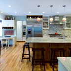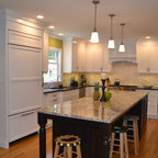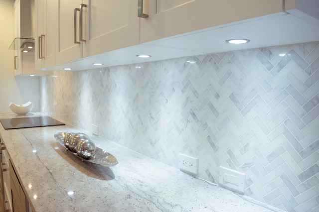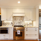 Неиссякаемый источник вдохновения для домашнего уюта: параллельная кухня среднего размера в стиле современная классика с обеденным столом, врезной раковиной, фасадами в стиле шейкер, белыми фасадами, гранитной столешницей, серым фартуком, фартуком из каменной плитки, техникой из нержавеющей стали, полом из керамической плитки, полуостровом и бежевым полом — Houzz