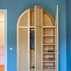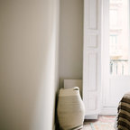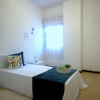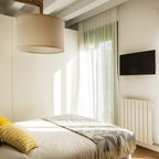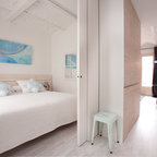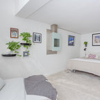 На фото: хозяйская спальня среднего размера в скандинавском стиле с белыми стенами и паркетным полом среднего тона без камина с — Houzz