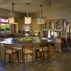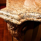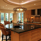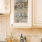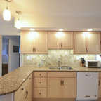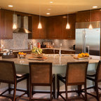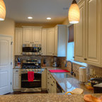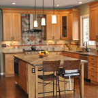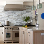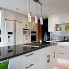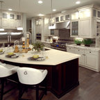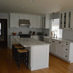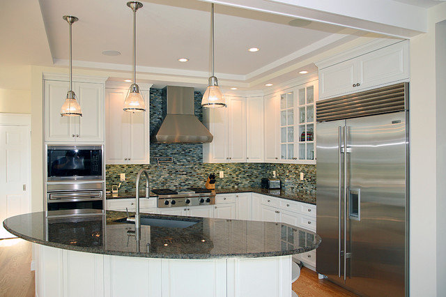 Стильный дизайн: угловая кухня-гостиная среднего размера в классическом стиле с фасадами с выступающей филенкой, белыми фасадами, техникой из нержавеющей стали, врезной раковиной, столешницей из гранита, синим фартуком, фартуком из удлиненной плитки, паркетным полом среднего тона, островом и коричневым полом - последний тренд — Houzz