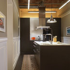 Пример оригинального дизайна: большая отдельная, параллельная кухня в стиле лофт с белым фартуком, открытыми фасадами, белыми фасадами, столешницей из акрилового камня, фартуком из плитки кабанчик, техникой из нержавеющей стали и паркетным полом среднего тона — Houzz