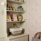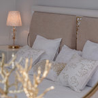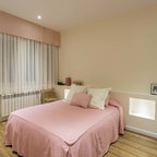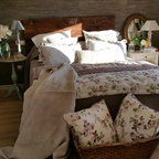 Пример оригинального дизайна: гостевая спальня среднего размера в стиле шебби-шик с бежевыми стенами, полом из керамической плитки и серым полом — Houzz