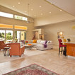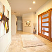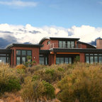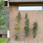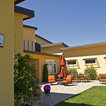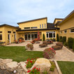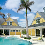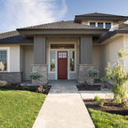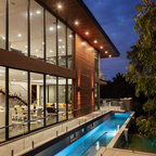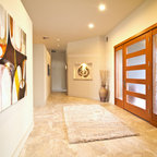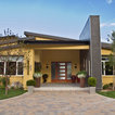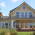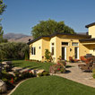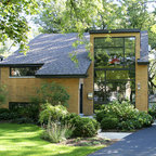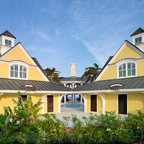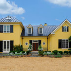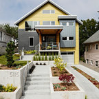На фото: одноэтажный фасад дома желтого цвета в современном стиле с облицовкой из цементной штукатурки с — Houzz