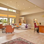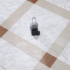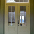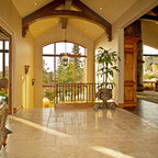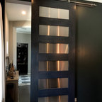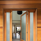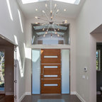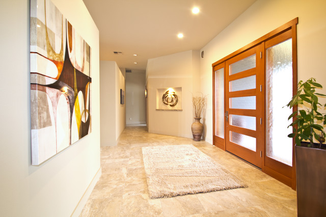 На фото: прихожая в современном стиле с бежевыми стенами, одностворчатой входной дверью и входной дверью из дерева среднего тона с — Houzz