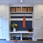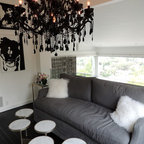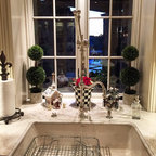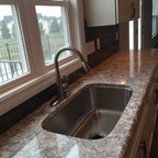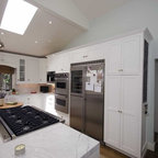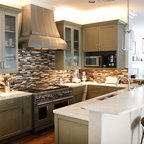 Пример оригинального дизайна: отдельная, угловая кухня среднего размера в стиле современная классика с врезной раковиной, фасадами с утопленной филенкой, серыми фасадами, гранитной столешницей, бежевым фартуком, фартуком из керамогранитной плитки, техникой из нержавеющей стали, полом из керамической плитки и серым полом — Houzz