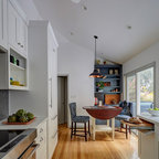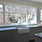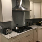 Неиссякаемый источник вдохновения для домашнего уюта: отдельная, угловая кухня среднего размера в стиле современная классика с врезной раковиной, фасадами с утопленной филенкой, серыми фасадами, гранитной столешницей, бежевым фартуком, фартуком из керамогранитной плитки, техникой из нержавеющей стали, полом из керамической плитки и серым полом — Houzz