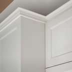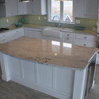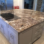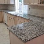 Свежая идея для дизайна: отдельная, угловая кухня среднего размера в стиле современная классика с врезной раковиной, фасадами с утопленной филенкой, серыми фасадами, гранитной столешницей, бежевым фартуком, фартуком из керамогранитной плитки, техникой из нержавеющей стали, полом из керамической плитки и серым полом - отличное фото интерьера — Houzz