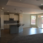 Неиссякаемый источник вдохновения для домашнего уюта: маленькая угловая кухня-гостиная в стиле современная классика с врезной раковиной, фасадами в стиле шейкер, белыми фасадами, белым фартуком, техникой из нержавеющей стали, островом, бежевым полом, белой столешницей, столешницей из кварцевого агломерата, фартуком из керамической плитки и полом из керамогранита — Houzz