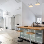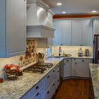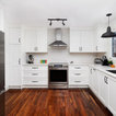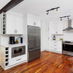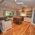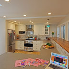 We removed the wall between the dining room and the kitchen. They did a flat ceiling in the kitchen but did not want to go through the expense or “mess” to scrape the rest of the ceilings on the main floor so we put in the false/decorative beam to split the areas.