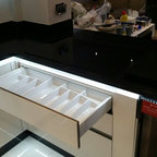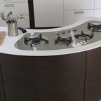 На фото: угловые кухни среднего размера в стиле модернизм с обеденным столом и столешницей из кварцевого агломерата — Houzz