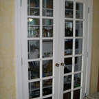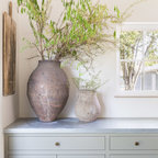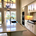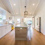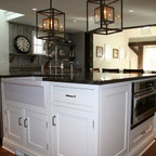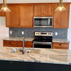 Пример оригинального дизайна: п-образная кухня среднего размера в стиле кантри с обеденным столом, врезной раковиной, фасадами с выступающей филенкой, фасадами цвета дерева среднего тона, гранитной столешницей, серым фартуком, фартуком из керамической плитки, техникой из нержавеющей стали и светлым паркетным полом — Houzz