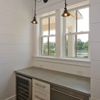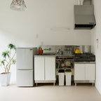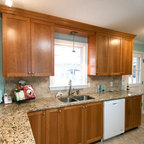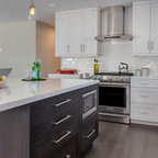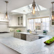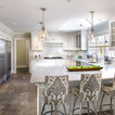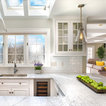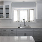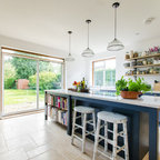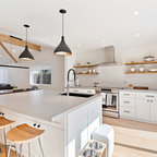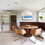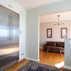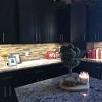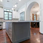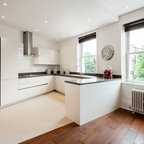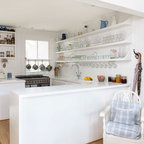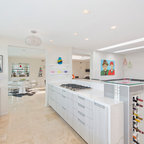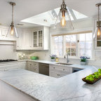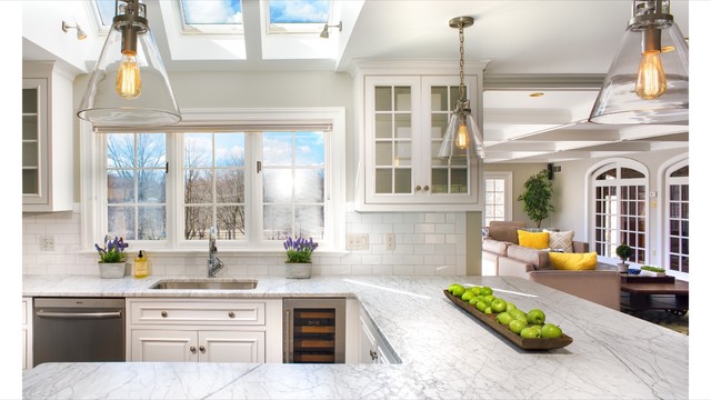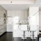 Пример оригинального дизайна: п-образная кухня-гостиная среднего размера в стиле современная классика с врезной раковиной, стеклянными фасадами, белыми фасадами, мраморной столешницей, белым фартуком, фартуком из плитки кабанчик и техникой из нержавеющей стали — Houzz