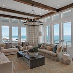Пример оригинального дизайна интерьера: огромная открытая гостиная комната в морском стиле с белыми стенами, паркетным полом среднего тона, камином, телевизором на стене и фасадом камина из кирпича — Houzz