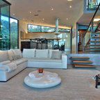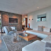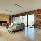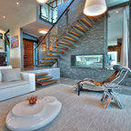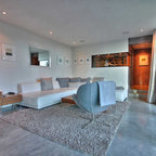Создайте стильный интерьер: гостиная комната в стиле модернизм с серыми стенами, фасадом камина из камня, двусторонним камином, бетонным полом и телевизором на стене - последний тренд — Houzz