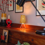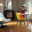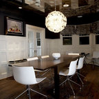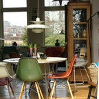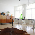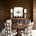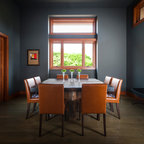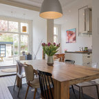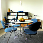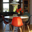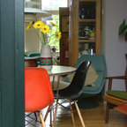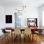 Идея дизайна: столовая в стиле ретро с паркетным полом среднего тона — Houzz