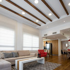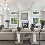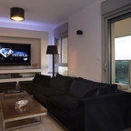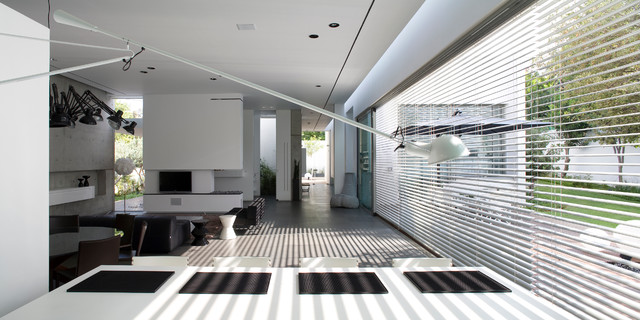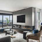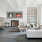 На фото: большие открытые гостиные комнаты в стиле модернизм с белыми стенами, телевизором на стене и серым полом без камина — Houzz