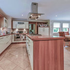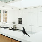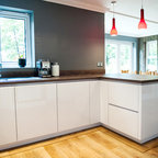 Идея дизайна: параллельная кухня-гостиная в современном стиле с плоскими фасадами, столешницей из кварцита, светлым паркетным полом, белыми фасадами и красным фартуком — Houzz