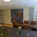 Multiple pendant lights add texture and mood lighting, whilst adjustable spotlights light up key shelves and spots on the island at nightime.