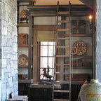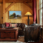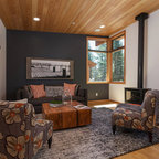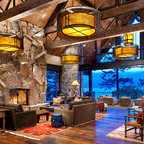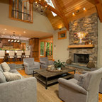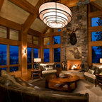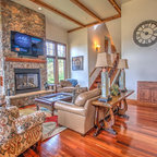 Стильный дизайн: гостиная комната в стиле рустика с стандартным камином и фасадом камина из камня - последний тренд — Houzz