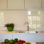 Идея дизайна: кухня в стиле фьюжн с фасадами с утопленной филенкой, белыми фасадами, фартуком из зеркальной плитки и светлым паркетным полом — Houzz