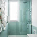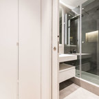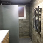 На фото: маленькая ванная комната в современном стиле с серой плиткой, керамической плиткой и душевой кабиной с — Houzz