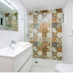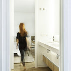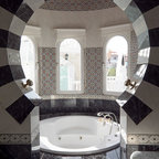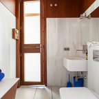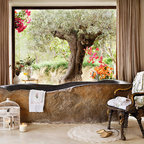 Пример оригинального дизайна: ванная комната в средиземноморском стиле с плоскими фасадами, светлыми деревянными фасадами, душем в нише, душевой кабиной, раковиной с несколькими смесителями, открытым душем, бежевыми стенами и бежевым полом — Houzz