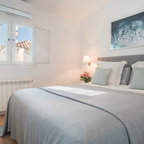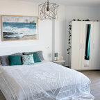 На фото: хозяйские спальни в морском стиле с бежевыми стенами и паркетным полом среднего тона без камина — Houzz