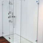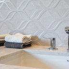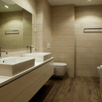 Стильный дизайн: ванная комната в стиле современная классика с открытыми фасадами, унитазом-моноблоком, серой плиткой и раковиной с пьедесталом - последний тренд — Houzz