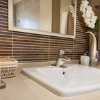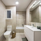 Идея дизайна: большая главная ванная комната в средиземноморском стиле с ванной на ножках, душем в нише, белой плиткой, плиткой кабанчик, белыми стенами, полом из керамической плитки, раковиной с пьедесталом, разноцветным полом и душем с распашными дверями — Houzz