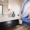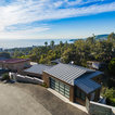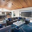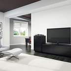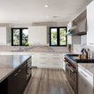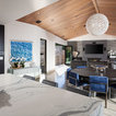 Another shot of this versatile domain. Note the central stairs leading down to the bedroom level of the house and the elevator next to it. Making the levels of this hillside home easy to navigate was an important goal.
