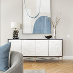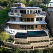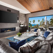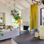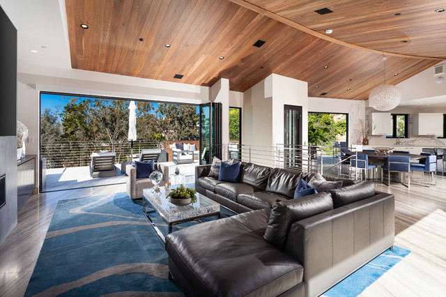 Пример оригинального дизайна интерьера: огромная гостиная комната в современном стиле с полом из травертина — Houzz