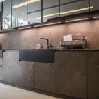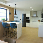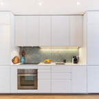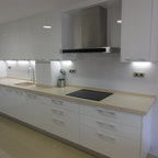 Идея дизайна: п-образная кухня среднего размера в современном стиле с врезной раковиной, плоскими фасадами, белыми фасадами, техникой из нержавеющей стали, бетонным полом, островом, обеденным столом, столешницей из акрилового камня и белым фартуком — Houzz