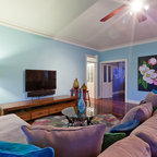 Свежая идея для дизайна: парадная, изолированная гостиная комната среднего размера в классическом стиле с красными стенами, ковровым покрытием и серым полом без камина, ТВ - отличное фото интерьера — Houzz