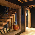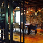 Выдающиеся фото от архитекторов и дизайнеров интерьера: столовая в стиле лофт с темным паркетным полом — Houzz