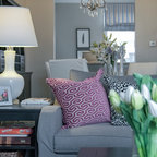 White walls with color in pictures, rug, and pillows