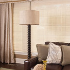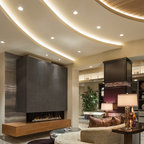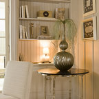 I like the multiple uses for the media area- tables and bench and the large photos flanking the TV