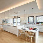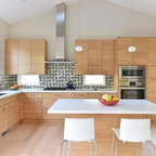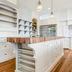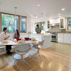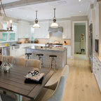 На фото: со средним бюджетом п-образные кухни среднего размера в стиле современная классика с обеденным столом, врезной раковиной, фасадами с утопленной филенкой, белыми фасадами, гранитной столешницей, техникой из нержавеющей стали, паркетным полом среднего тона и островом — Houzz